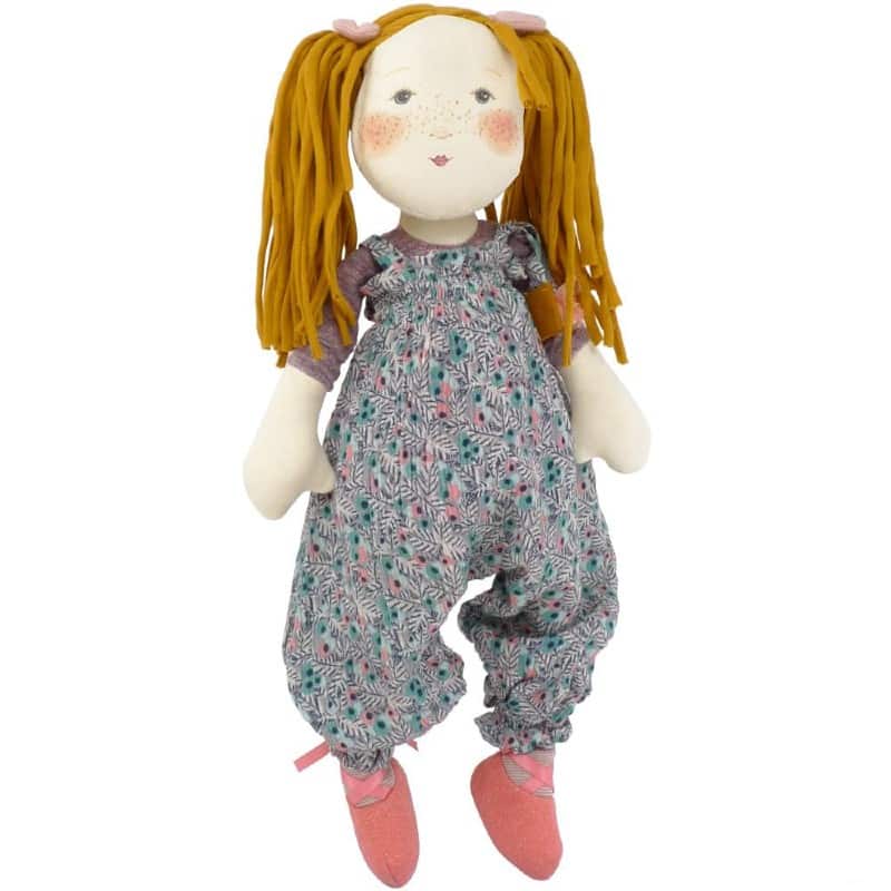Violette es una muñeca de trapo de tamaño mediano con una cara suave y delicadamente ilustrada con el pelo largo y rubio.